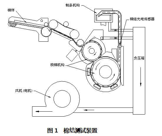 棉結測試裝置如圖1所示。在測試時,棉條(或原棉)被按照一定操作方法送至分梳輥(開松輥)上。分梳輥高速旋轉,梳針將喂入的棉花進行開松,梳理、除雜后,形成近似均勻單纖維流。在負壓的作用下,纖維流進入高速轉杯形成棉帶。