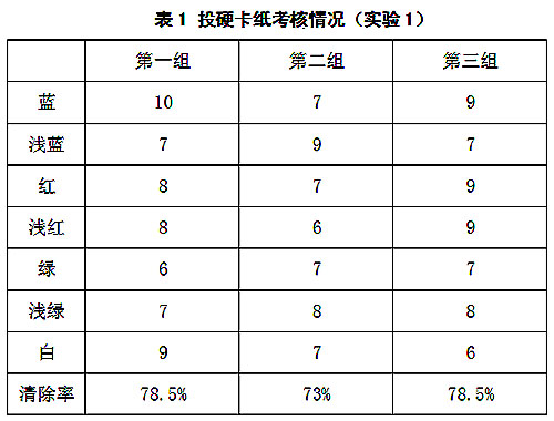 CS808棉花異纖清除機目前在某廠家做實驗使用5個多月,現場產線為圓盤機 ,開松效果不如清梳聯,并且每天檢測的棉花品種都不同,且差異較大,因此根據現場情況創建多個分類器,不同的分類器設置不同的算法參數,滿足配棉頻繁變化的需求。投擲樣本為硬卡紙,長度為 40mm×2.0mm的七種紙條(紅、綠、藍、淺紅、淺綠、淺藍、白色熒光)混合后,在距離檢測通道前正中間開一個8mm小孔,在棉花通過檢測區域時,在該小孔投放樣本,投放完畢后從廢棉中檢出投放樣本,試驗結果如表1和表2所示。